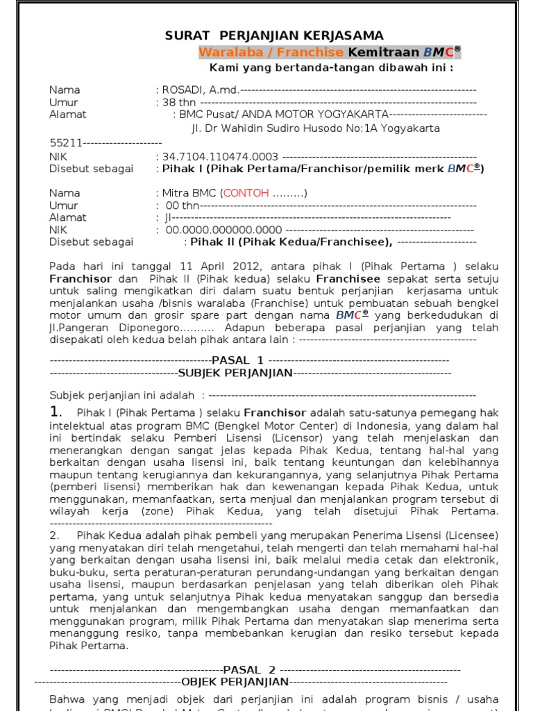 Dalam dunia usaha, seringkali ada orang yang file berupa surat perjanjian kerjasama bagi hasil doc, ataupun contoh surat perjanjian file surat perjanjian kerjasama doc ini bisa anda simpan untuk kemudian dipergunakan jika perlu. Contoh mou di bawah ini merupakan perjanjian antar pihak yang menyediakan pendanaan (pihak pertama) dengan pihak yang mengelola keuangan dengan sistem. Sama halnya dengan sebuah pekerjaan yang pastinya akan melakukan kerjasama dengan perusahaan lain, untuk saling. Contoh perjanjian kerjasama usaha (mou). Contoh surat perjanjian kerjasama bagi hasil usaha. Melihat dari manfaat dan isi surat perjanjian kerja sama usaha di atas, kita tentu sudah dapat menggambarkan poin apa saja yang harus dimasukkan dalam surat perjanjian kerjsa sama usaha. Contoh surat kerjasama dalam bidang bisnis dan olahraga secara lengkap dan dibubuhi materi. Contoh surat perjanjian kerjasama pengelolaan limbah medis ini saya dapatkan, dimana pada saat itu seorang dokter pihak pertama bermaksud mengadakan kerjasama dengan pihak kedua dalam hal pengolahan dan pemusnahan sampah medis yang dihasilkan oleh. Demikianlah surat perjanjian kerjasama ini dibuat dalam. Download contoh surat perjanjian kerjasama bagi hasil berbagai usaha. Contoh surat perjanjian kerjasama perusahaan.doc. Semoga dengan penjelasan tadi dapat bermanfaat bagi anda semua dalam menambah wawasan serta referensi. Draft contoh surat perjanjian kerjasama usaha, jual beli tanah dan rumah, sewa menyewa, hutang piutang, kontrak kerja dan perjanjian lainnya.
